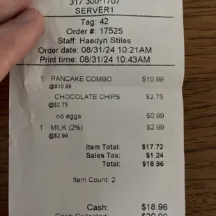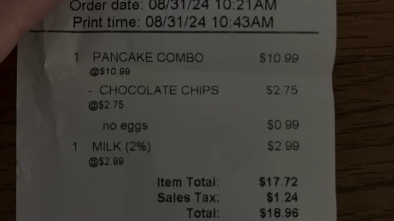 I went in this morning around 10 AM to have breakfast. I was seated quickly and my waitress came over promptly to take my order. She, and the rest of the service, was amazing. There were some loud kids, but for a breakfast place on the weekend that is expected and i can live with it. However the food and the bill were a different story. I ordered a breakfast combo with chocolate chip pancakes, hashbrowns, bacon, and a glass of milk. The pancakes were the best part of the meal, crispy but fluffy, and they had a good flavor. The bacon was just okay, you can tell it is microwaved, it came out luke warm and very thin. The hash browns were also microwaved, the cheese was not fully melted and they were not crispy at all, and they had no seasoning. One of the first times I've felt I HAD to add salt and hot sauce to get some flavor. Then the bill. So the pancake combo was 10.99 (no issue there) however they charged me 2.75 to add chocolate chips, when it only costs .99 cents to add them to individual orders of pancakes. If i had been made aware of this when ordering, i would've changed my order. They also charged me 0.99 cents to not have eggs with my combos, being charged to not eat something is definitely off putting. Overall the bill with a 20% tip was 23 dollars. Not bad for a breakfast place, but Bob Evans would've been much better for a similar price.I would say to avoid this breakfast place and go to Hotcakes Emporium next door, or a place like Cracker Barrel.
