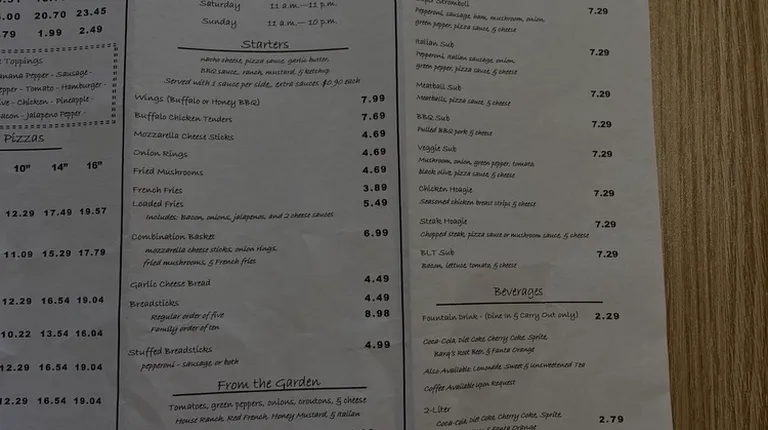 First time I've ate here. The pizza was really good. Had the bbq chicken pizza and even though the menu had changed(had to ask for updates version) because online menu wasn't right, it was delicious. Also tried few appetizers. The fried mushrooms were excellent but the mozzarella sticks were just ehh. Also had the garlic cheese bread which was pretty tasty and marinara looked to be homemade which was a pleasant surprise. Def would recommend this place. I always love to support the small businesses in our areas.