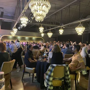 My husband and I went here to see Titus Burgess and I can't say enough good things about it. Not only was he spectacular but the ambiance, food, service and sound system were all wonderful. Upon entry we were immediately greeted by two friendly hosts and taken to our booth that was we found to be the perfect seat. A waistress promptly took our order and each item came out in a timely manner. The whipped feta dip was delicious and the chocolate cake was perfectly moist and rich. The shrimp were a little over cooked, but the other items made up for it. My only complaint is my wine glass was a bit dirty around the stem with hard water build up. Other than that little detail it was a wonderful night and I can't wait to visit again soon.