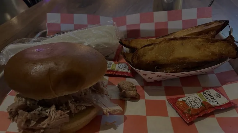 The Pig Pen BBQ is located inside The Garage Food Hall in the Bottleworks District. It's a solid if unremarkable mid-range effort featuring primarily pork/BBQ main dishes including the usuals BBQ, pulled chicken, pulled pork, brisket, and others. There are platters and sandwiches available. They also have a selection of sides. Surprisingly, they only carry canned drinks except for bottled water. The canned drinks are all Coke brand and there's no iced tea option. I ordered the pulled chicken sandwich, a side of potato wedges, and a can of diet coke. Sauce options included sweet/mild, sweet/spicy, and honey-mustard. I did like that they carry Magnolia organic ketchup packets. Service was good and friendly. They brought the food to my table since I was almost directly across from them. How was it? Again, pretty mid-range. It wasn't great. It certainly wasn't bad. I ordered the sweet/spicy sauce and didn't find it to be spicy at all. The chicken was pretty nicely seasoned and serving size was solid. The potato wedges had nice, crispy edges and great flavor. I'd say the potato wedges were my favorite part of the meal. For $4, I got about a half-dozen large potato wedges. Would I eat here again? Sure. It wasn't the best BBQ I've had, however, it was solid enough that I would order it again. However, I'd also likely not hesitate to try something else given this is a food hall. I'm also always a little disappointed when there's not an iced tea option. I'm sticking with a 3-star rating and truthfully 3.5 is probably more accurate. 4 stars just feels too high - so, I'll go with the 3 and acknowledge that I could easily see myself craving those potato wedges. I will note that most of the sandwiches come with stuff (for example, cole slaw) on the sandwich - however, you can easily request plain as I did.