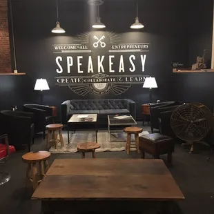 I'm reviewing the Speak Easy as an event venue, and it's a beaut. The space is an interesting layering of history, with exposed brick, industrial frames, and Corinthian columns, all muddled together. It makes for a lovely mixed-used venue, and I happened to be their for a storytelling event. Even when the space is beyond capacity, it doesn't manage to feel too crowded, and the acoustics hold strong even when it's pretty cozy.My only qualm is that there was loud maintenance work going on upstairs during the storytelling event. Since there's basically no ceilings, it made it hard to hear the speakers for such a quiet event. This is probably par for the course in a coworking space, with the right hand not talking to the left, but seemed completely avoidable with proper management.