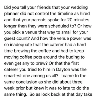 Agree with the other 1 star review posted on yelp. We expressed disappointment. Got this email from the owner . Of note, at our event, nuts were served to an individual with anaphylaxis to nuts (which was clearly defined and discussed prior to the event). And a guest witnessed a waitress use the restroom and return to work without washing her hands. Lastly, when the bread tray was empty, a guest asked for it to be removed, it was placed by a waitress under the table....