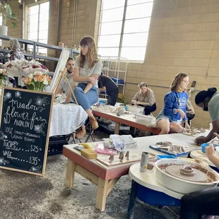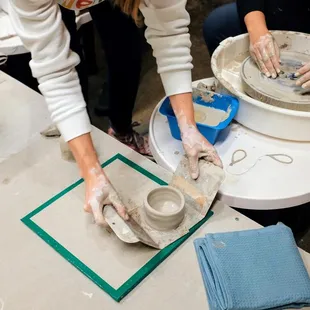 Okay-yes, their door is yellow! You park out front of brick building and walk around side to the yellow door and knock or call. Someone saw us and let us in. I signed my group of friends for a private two hour class on a Saturday night. Our instructor, Christina, arrived shortly after. We got our container of water, sponge, tools, and clay. She gave us an overview of what the night would look like and started with about a twenty minute walk through. She was pretty soft spoken, so had to really lean in to hear her. Most important things to remember:Keep your clay wet. You want it to be glossy. Keep your elbows grounded-tucked in it on your knees is good. Your back will be sore from the improper posture you have to maintain for this to work. You might fail. It's okay. Try again! Wear something you don't mind getting clay all over because you will! It is messy and you will get "dirty". Christina let us know that she could help us along the way and not to worry if something didn't work. It's a hard class to take, not gonna lie. I have a newfound appreciation for all the pottery I admire at art fairs. It's also not easy for me to fail and it was okay in this setting because I was with great friends and we were all trying something new. We laughed and had a great time. I would recommend this 100% to anyone looking to get outside of their comfort zone!