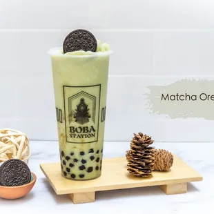 a glass of boba milk tea and a pine cone