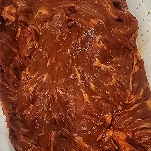Marinated shoulder meat ($5.99/lb) ok; flap meat is better