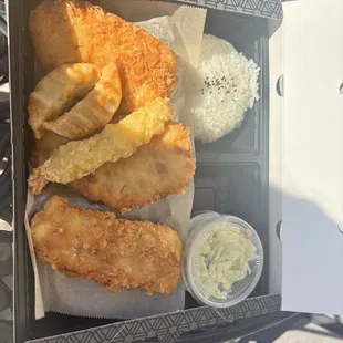 Best seller Pork Katsu - comes with gyoza, shrimp tempura, coleslaw, pickled veggies & rice