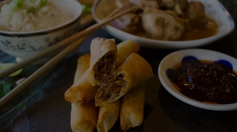 Pancit Canton + 3 piece lumpia with house made soy calamansi sauce & sweet chili sauce included