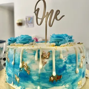 Beautiful smash cake and Topsy Turvy with broom made by Poul's Bakery.