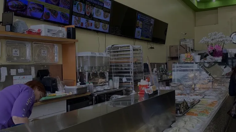 Com thit nuong cha gio. Steam rice with grilled pork and egg rolls. Serving with fish sauce or soy sauce. Com trang voi thit nuong va cha gio. Phuc vu voi nuoc mam hoac nuoc tuong.