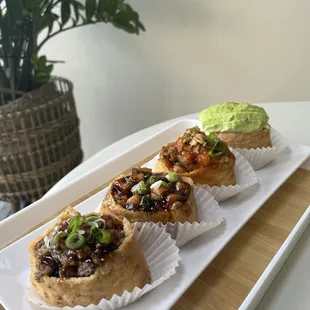 Two Left: Spicy Salmon Top Right: Grounded Tuna Bottom Right: Creamy Scallop