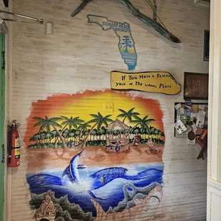 a blue building with a palm tree in front of it