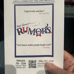 This is a community, local theater; pretty much by volunteers. The play tonight was Rumors by Neil Simon. The stage was good, costumes pretty but the play lasted too long.