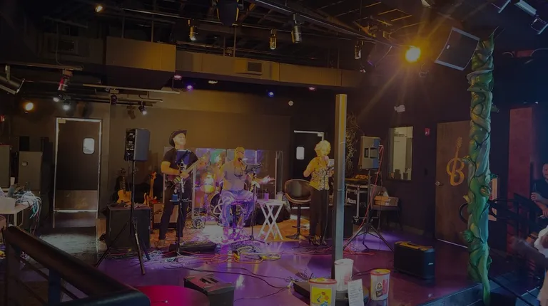 Kitchen doors behind stage, servers walking by, even crossing stage with food in front of performers....
