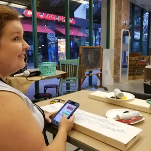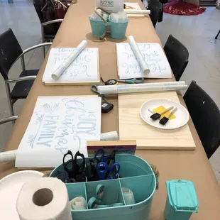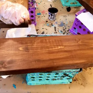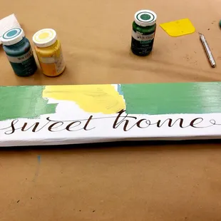 Found this business via Local Flavor or probably wouldn't have known about it. Cute little shop in the heart of Edgewood, owned by a mother and daughter duo. They were both so sweet & helpful! They have hundreds of designs to choose from or they can pretty much create just about anything you want. They also have tons of different shapes and sizes of boards from which to choose. The daughter explained the whole process to us and let us roll. You start by staining the board then blow drying it so you can get to the next step. That would be applying the sticker stencil then painting with a good 3 or so coats. Let that baby dry then voila! Masterpiece done. I highly recommend this business! Support locals, have a blast (ummm BYOB!!), and create a gift (or keep for yourself )