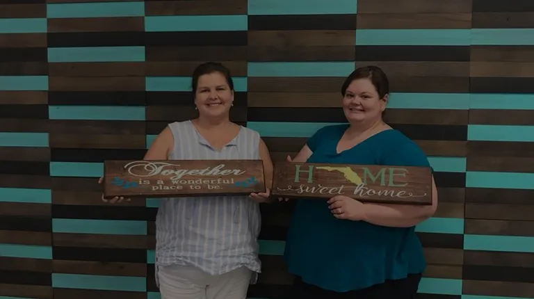 Each year a group of us girls have a holiday get together weekend in Jacksonville filled with fun activities. This year on the list was Beautifully Divine DIY Woodcraft Studio. When we first walked in we saw pre-made signs in all sizes as well as other cute items were for sale. Most of the store is setup like an art studio with tables, supplies, stations and VERY helpful assistants Lesa (Lisa?) and Elizabeth. First you sign up online and pick your project. Once you are at Beautifully Divine DIY Woodcraft Studio they provide all the materials and step by step guidance needed. Lisa turned on the Christmas music and guided us through step one, choosing your stain color and applying it. With gloves on you wipe the srain on and towel smooth it. Then you use a hairdryer to speed up the drying time. Next you do a few steps to put your stencil on, paint the stencil, dry it and take the stencils off. Easy peasy! You end up with a lovely woodwork piece to give as a present or hang in your home.There is also an option to have hardware put on the back of the wood board so you can hang it on the wall. Everyone's turned about super cute! ... and most important we all had a great time