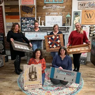 Board & B rush is an incredibly fun time out. Perfect for girls' nights, date nights, parties, or corporate events.My group opted to go on a Thursday night, for Paint Your Own Project (PYOP). We had six women in the group, and we each pre-paid and selected our projects.When we arrived, our signs, stencils, and aprons were waiting for us on a dedicated table. Owner Beth welcomed us, and Melissa was the team member assigned to helping us out. She confirmed that all our stencils were correct, and then left us to our Bring Our Own wine and snacks.At the start of the assigned time, Beth reviewed directions, and then left us to work. She paused us every so often to give instructions along the way, and then we filled the time with distressing, staining, and painting.All of us were so thrilled with our completed projects, and I can't wait to go back!