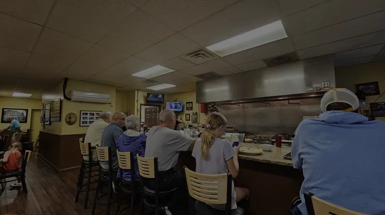 Completely exposed kitchen across from the bar seating. Initially thought it added character to the place but it just added to the noise level. It also provided a view of the cooking that made me a bit uneasy about the level of cleanliness. Wife's omelette had an egg shell in it and my breakfast sirloin appeared more boiled than seared. (It was definitely cooked on the flat top as I got to watch the whole time, but not properly dried before cooking).Service was friendly and there were plenty of opportunities to refill coffee. Towards the end of the meal it was difficult to get anyone to make eye contact long enough to pay the final bill.