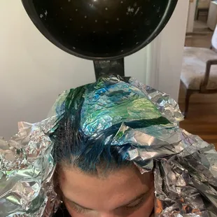 I darkened her roots added lowlights and highlights then an overlay of red-pink