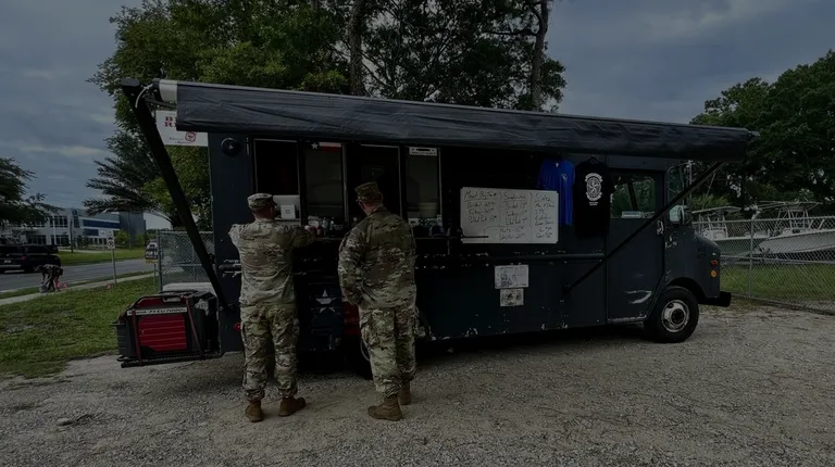 a soldier taking a picture of a little girl standing in front of a food truck