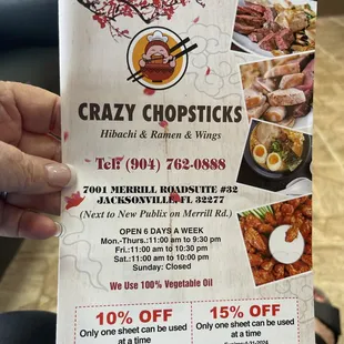 This is my second visit in 1 wk since I discovered Crazy Chopsticks. Both visits I ordered the Tonkotsu ramen because it's just so delicious and I couldn't get myself to order anything else, but there are several ramen choices and all sound great. My husband ordered the NY strip steak hibachi the first visit and loved it, said the steak was very tender and everything was delicious (except "the clear soup was a little bland"). Second visit he had the chicken katsu and reported it was delicious, crispy and flavorful with a black garlic sauce we drizzled over it with white rice was two thumbs up, also the miso soup was a better choice in his opinion.The service is great, they're quick and happy to have your business, this is a counter service take out restaurant.I'm so happy to have found this place and to recommend this neighborhood Asian ramen joint!