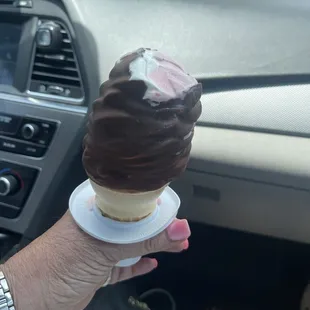 Regular-sized soft serve chocolate ice cream cone.