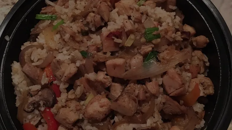 Chicken and bacon (not sure if they added the bacon) fried rice with a shrimp egg roll