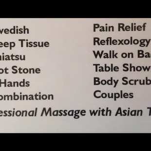 One of the best ever massage places. Coco did my massage and she was very delicate and careful. Of course she had asked how I wanted my massage and her technique was perfect. The owner was also very sweet and helpful.Inside the facility was very clean and calming. The decor was beautiful and the place was just wonderful. The great thing is they open late! They have foot massage, Swedish, shiatsu, hot stone, 4 hands, combination, pain relief, walk on back, table shower, body scrub, and a couples massage. The pricing varies but it's pretty decent compared to other places. You should be open about how you want your massage by telling them what areas hurt and how much pressure you would like. So far so good on my experience. A great place to unwind until 10:30 pm :) also Monday through Sunday 9:30 am until 10:30 pm everyday!