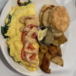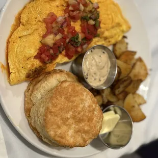 Fantastic experience from start to finish. Gorgeous interior design for inside dining and patio seating outside. We arrived around 10am and did not have a reservation but luckily grabbed a table inside pretty immediately. Our server, Fabian, was fantastic, attentive, helpful and friendly. We both ordered omelettes with a side of potatoes and a biscuit inside of toast. Highly recommend the delicious potatoes with the "secret" seasoning (we asked but they are keeping that to themselves) and upgrading your toast to a biscuit. The biscuit was enormous and cut in half and toasted. Fluffy on the inside and crispy on the outside. The star of my plate was the crab cake omelette. We are very particular about crab cakes after living in Maryland for many years and the crab cakes inside this omelette was amazing. The egg was fluffy and light, surrounding the crab and spinach, with a perfect amount of tomato and remoulade sauce on top. Fabian checked on us often, was quick to refill our coffees and more cream and sent us with to-go coffees as well!