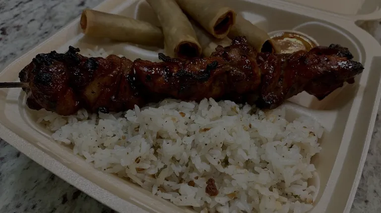 Menu Items: Chicken and Pork BBQ Stix, Veggie Pancit, Beef lumpia, Garlic Rice and Java Rice.