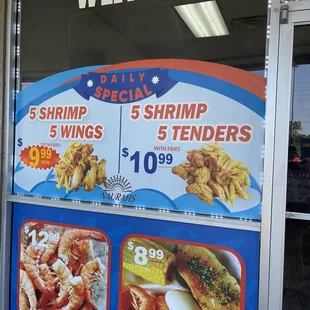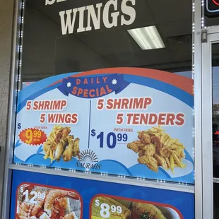 a sign advertising shrimp and wings