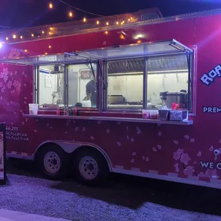 a red food truck with the name of the restaurant