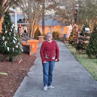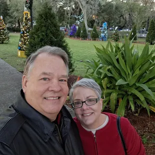 What a beautiful park at Christmas time, day and night, with all the themed trees, gazebo, swings, and water fountain.
