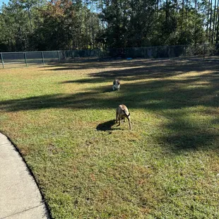 Good size dog park! Has a separate small/large side for pups to play. They also have a shaded area for humans to sit under while the puppers play, and a hose/drinking area to clean your dogs after playing.