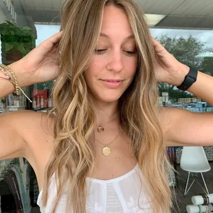 this look can be achieved with balayage or blonde highlights and a shadow root