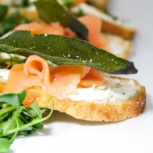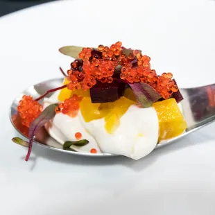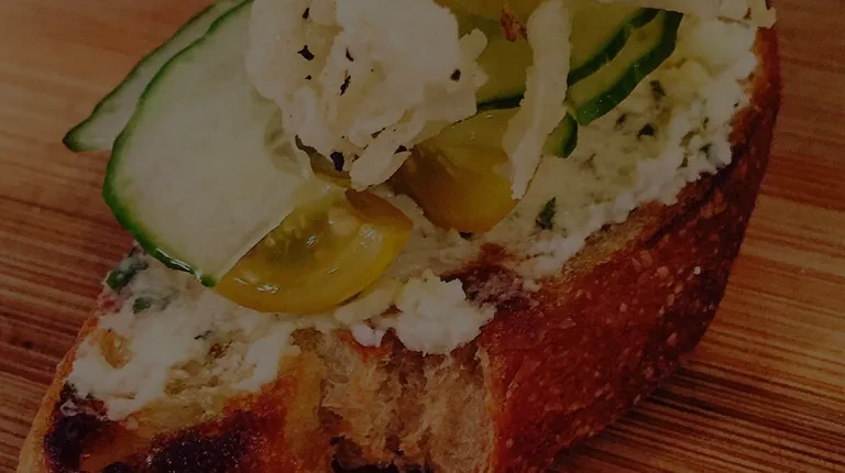 Tomato bruschetta with an Avocado Schmeer topped with balsamic caviar