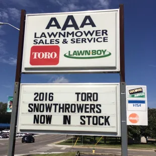 These guys have been my go-to for lawnmowers and service for over 12 years. When I lived out of town I made the drive to KC north just to have AAA complete the service. Wait time is minimal, staff is friendly, parts reliable, and service always as promised or SOONER. They are busy and it is easy to see why--great merchandise and knowledgeable staff. The only time I had any difficulties after service I took the mower back and it had been MY ERROR. They were patient, friendly, showed me my error, and didn't charge me for their time. WONDERFUL FOLKS! Highest recommendation.