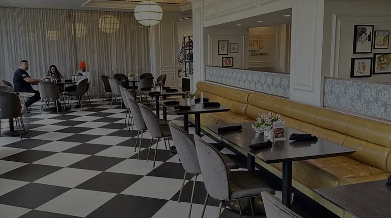 Attractive features of American Slang include a large black and white checkered floor and sweeping view of the iconic Country Club Plaza.