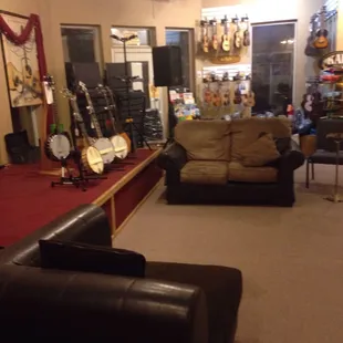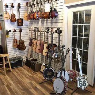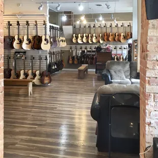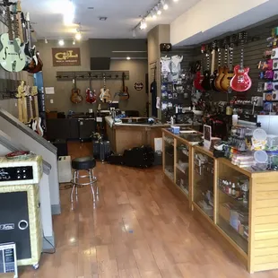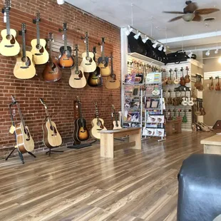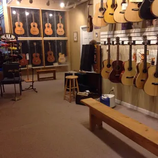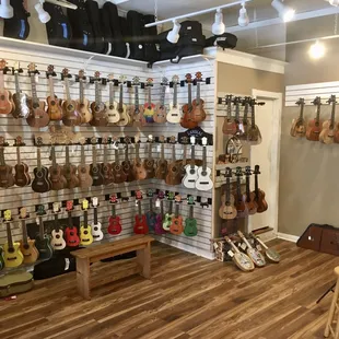 I'll start off by saying that I know little about guitars or really anything music related. Usually that makes me the customer to be avoided. Especially since I wasn't in the market to buy anything expensive. But at this place I felt no negativity towards my lack. I was greeted by the owner who shared with me some of the stores history and gave me a mini personal tour. Along the journey he answered all of my random questions. Including ones about guitar repair, which they personally do there. I also saw some kids and an adult coming in for various private lessons which they had private, sound secluded rooms for in the shop. They had a large selection of guitars and ukuleles. Pretty cool actually, some of them were quite unique. The store was clean and gave a vibe that felt like it encouraged you to hang around for a while (classic mom and pop type feel). I often feel nervous to pretend to strum a guitar in music shops, as if I'm being judged or something. But here was again quite comfortable. I ended up buying a book on drumming which was fun. I'd certainly shop this place when considering purchasing.