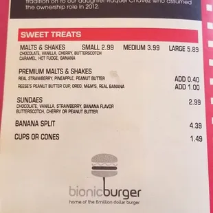 If you're wanting a good burger with all the fixings Bionic Burger is the place to go! The menu is family friendly. Service is prompt and the onion rings & fried mushrooms well once you try them you'll simply want more!