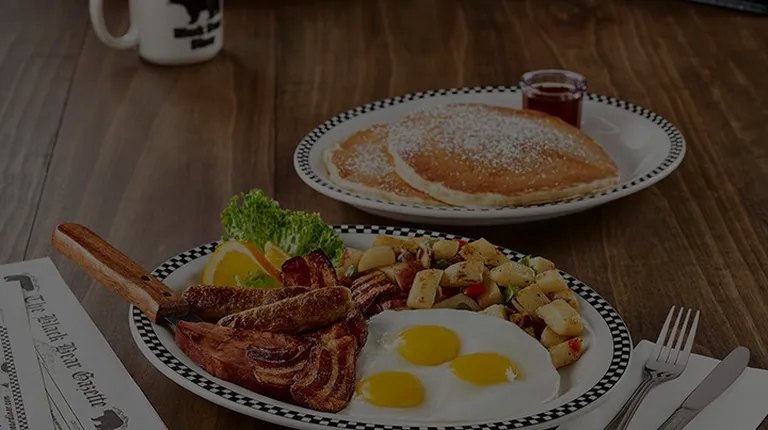 Copious menu, good sausage and french toast stuffed with blackberries.Great brunch options.Good coffee.Good service.Ambiance...like cracker barrel...Eggs, Benedicts,, burgers, chicken fried steak and more on the newspaper menu.