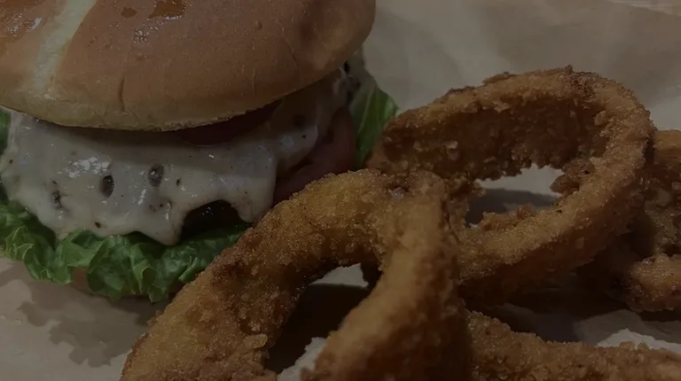 Bacon cheese burger with onion rings.
