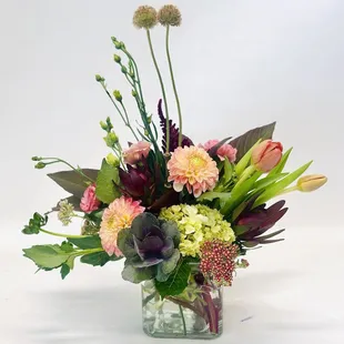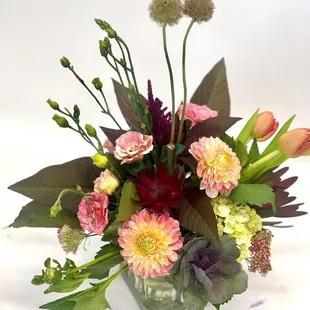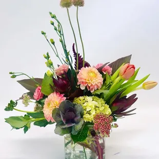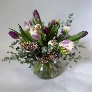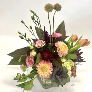 A bright mix of colors using some tulips and kangaroo paw.