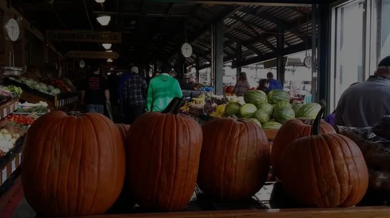 a produce stand with pumpkins