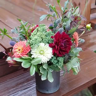 Anna. An organic, unstructured garden style arrangement in a rustic container.
