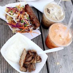 Pad thai, chicken satay, pork and rice
