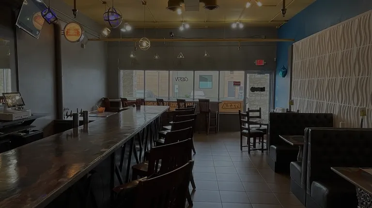 a long bar with wooden chairs