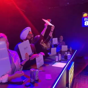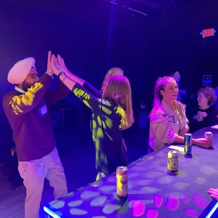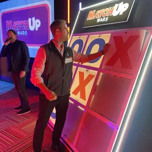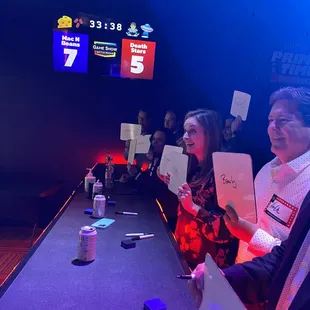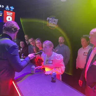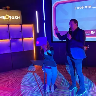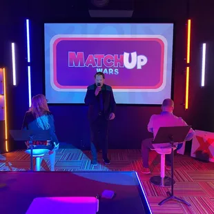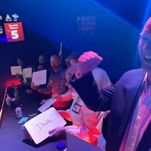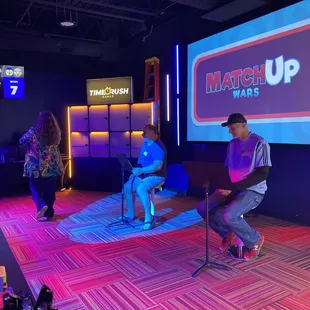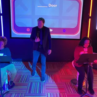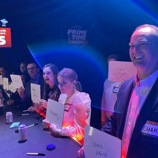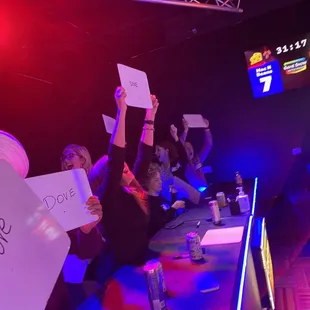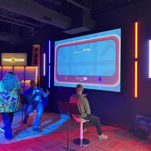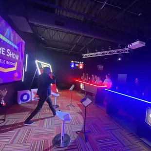 Super fun time!If you'd like being on a game show, you'd like this! It's loud, it's energized, it's exciting! (A bit tricky if you're highly sensitive...)I'm not sure how the game show hosts don't lose their voice more often, because he was so animated! There are high tables with chairs in the back of the rooms for food and drinks (which they sell out of their cooler out front).