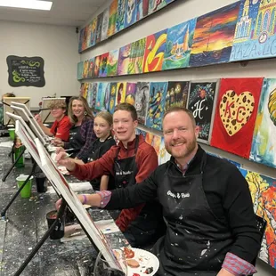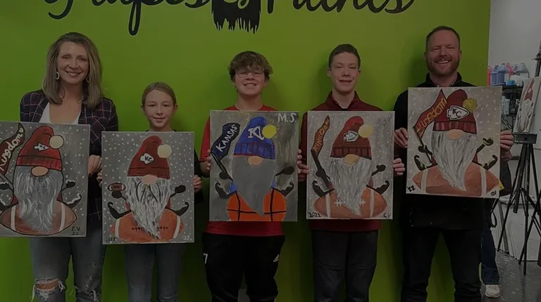 I booked a private party as a family gathering and this event ended up being the highlight of our holiday week! There were the obvious concerns at first...variety of ages (grand kids 10, 13 to grandparents in their 70s). We have a few non-creatives and perfectionists in the group, but things couldn't have turned out better.We chose to paint "Paradise" with owner, Amy's guidance and instructor, Wanda was extremely patient. We brought wine and ordered pizza and they provided water.Turns out the paints dry pretty quickly, so it was easy for Wanda to guide us through "repair" work and everyone finished with something to be proud of.Without question, we will rebook and choose a different painting for future family gatherings in KC! Thanks to Amy and Wanda for giving us a priceless family memory!