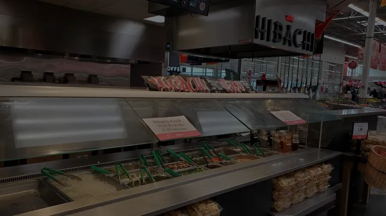 Hibachi area with meat and veggie selections. They give you 8oz of protein - chicken, beef, shrimp, eggs and maybe pork