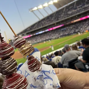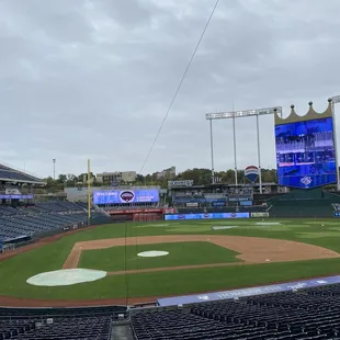 My 16th MLB stadium. For an older stadium I liked it. It is literally next door to the Chiefs Stadium, they share the same parking lots. The fountains are nice, the crown scoreboard is cool. We did get hit with a rain delay and it was cold - there is literally no seating in the concourse until you're in a premium area. I stood at the bar, trying to keep myself warm. We got stuck in a major traffic jam trying to get out after the game too. The fruit stick with brownie pieces on them are nice.